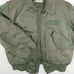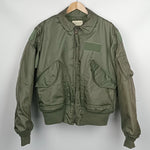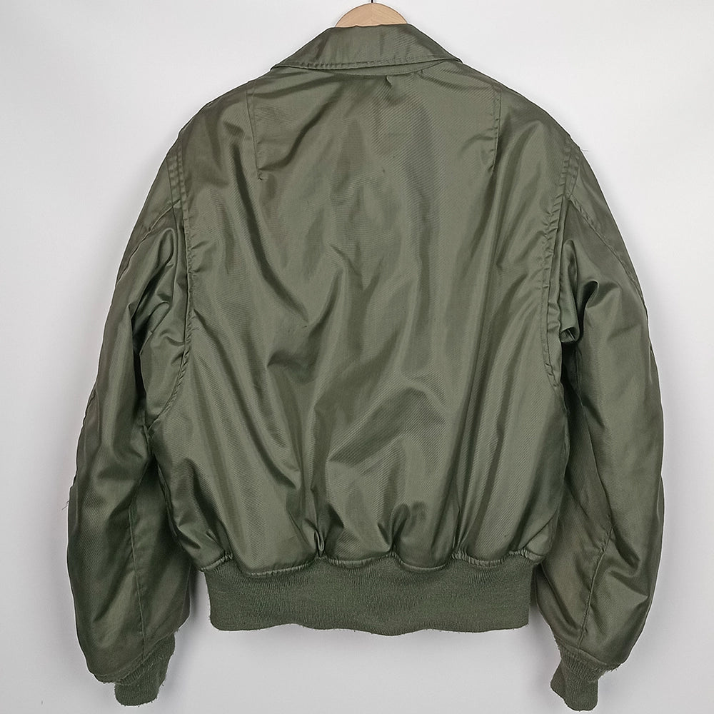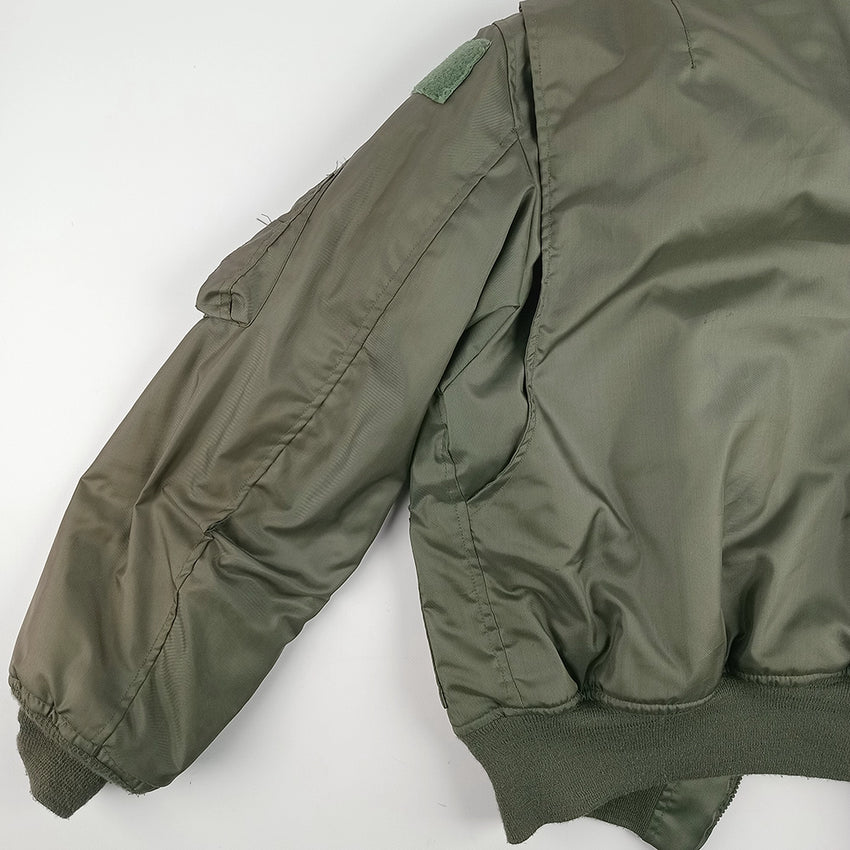 The U.S. Air Force CWU-45/P flight jacket is a cold-weather version of the CWU-36/P, introduced in the 1970s to replace the iconic MA-1. This 1976 jacket is the first pattern of the CWU-45/P and is designated as MIL-J-83388A. Constructed from fire-resistant aromatic polyamide, it features a front zipper, storm flap, knit cuffs, waistband, and two large front pockets. Designed for aircrew protection in cold conditions, it became standard issue for pilots and airmen. Its functional design and military heritage have made it a sought-after collectable and practical outerwear piece. This 1976 jacket has some fading/discolouration to the outer right sleeve and a 3cm opening in the same sleeve's back seam, near the elbow. To the interior upper left is a small vertical hole which may need repairing before it can open further. Inside the jacket is a hook & loop attached pouch which contains bright orange signalling fabric.