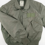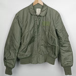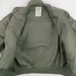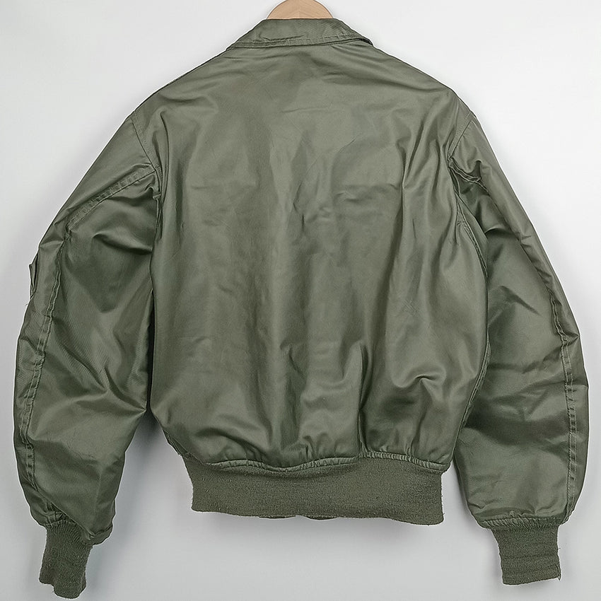 The USAF CWU-36/P Men’s Summer Flyers Jacket is a lightweight, fire-resistant flight jacket introduced in the 1970s to replace the MA-1 for warmer climates. Constructed from aromatic polyamide fabric, it provides protection against heat and flame while offering comfort during flight operations. Featuring a zip front, angled chest pockets and knit cuffs, it became standard issue for U.S. Air Force and Navy pilots. Its functional design and military heritage make it a sought-after piece for collectors and aviation enthusiasts. This jacket from 1993 is in good condition with light scuffs and stains to the outer fabric, particularly on the lower front. The elastic cuffing has pilling and 2 small holes to the right wrist cuff.