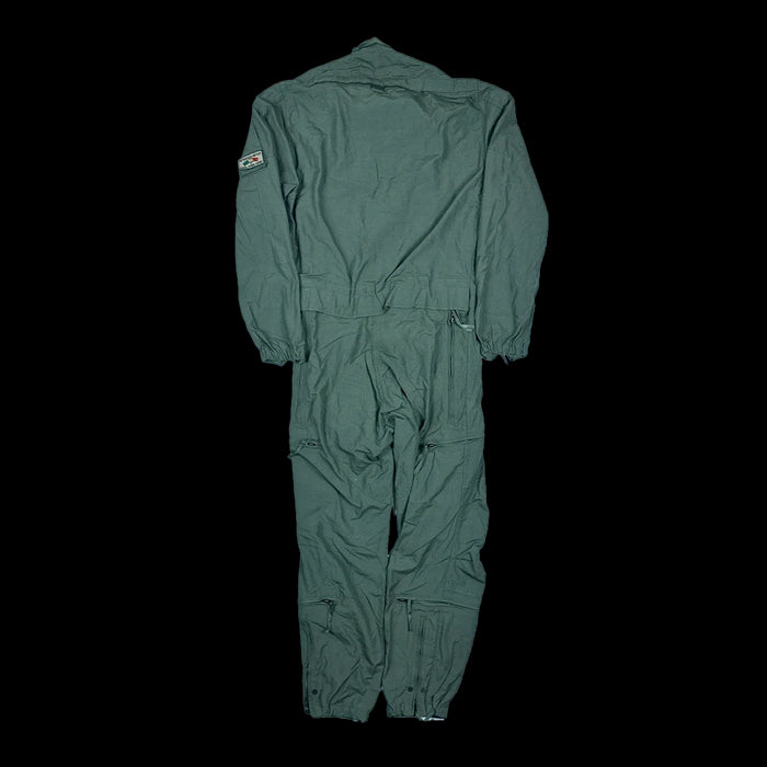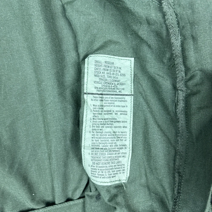 USGI surplus coveralls in a Small Regular size, featuring a full zip front and multiple utility pockets across the chest, waist, thighs, lower legs, and upper left sleeve. This example includes a film-related insignia applied to the garment.