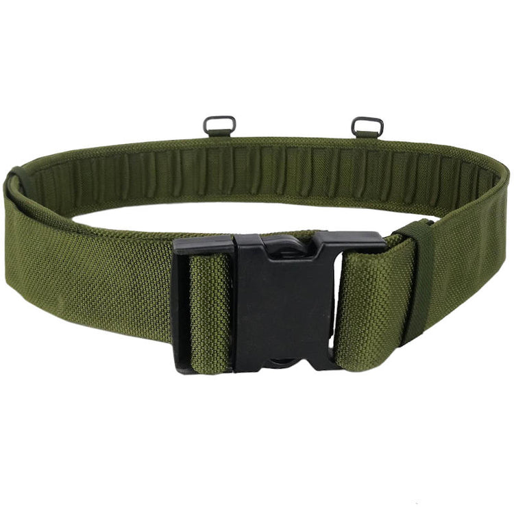 This is a British Army issue belt made from a heavy-duty webbing. To fasten things up, it has an oversized quick-release buckle and two metal d-rings for yoke attachment at the back.