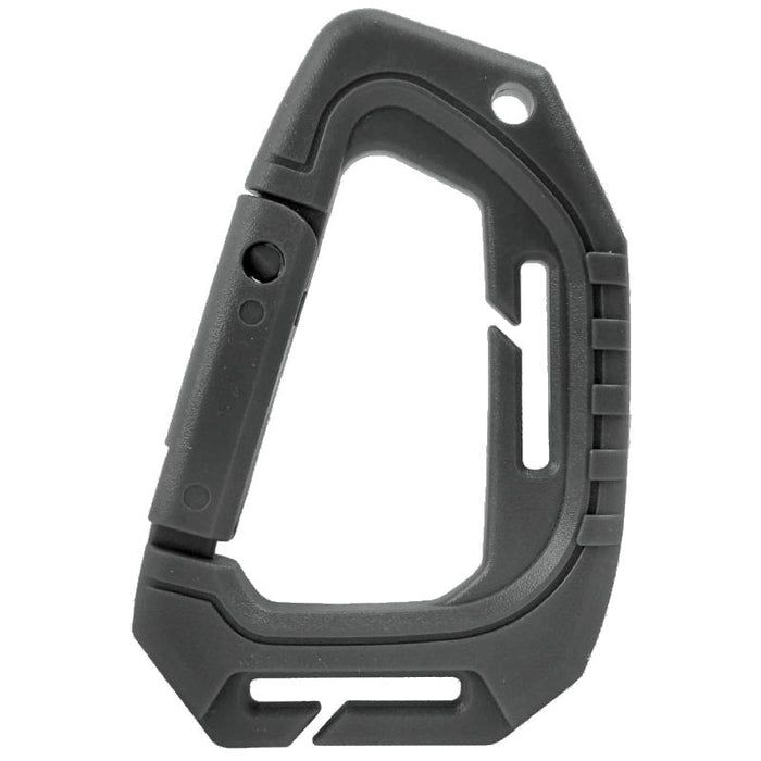 A tactical carabiner, or 'tac-link' is a lightweight clip for attaching accessories to a backpack or rucksack. This particular model features two slots for attaching to PALS or MOLLE webbing and a spring-loaded gate for securing accessories. As these are made from ABS plastic, they will not produce any irritating metal-on-metal noise, nor will they scratch paint. This also means they are not suitable for climbing or rescue operations.