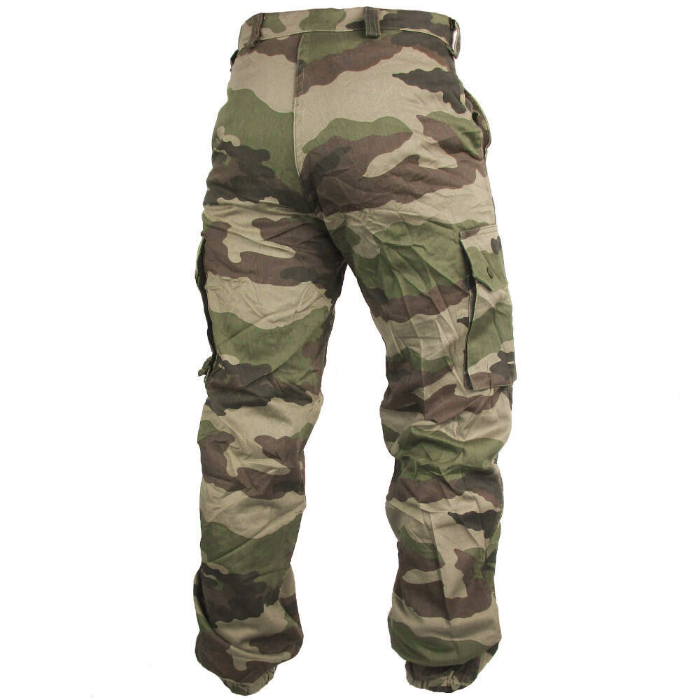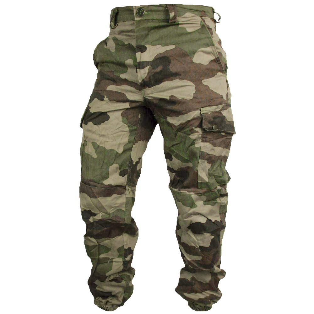 The French Army have issued a durable and practical trouser for their soldiers in case of a hasty retreat. These pants bear the popular CE (Central Europe) camouflage. The colours are similar to the U.S. M81 woodland camouflage but the large shapes in the pattern are distinctively French. The colours can vary with manufacture and age, as shown in the picture.