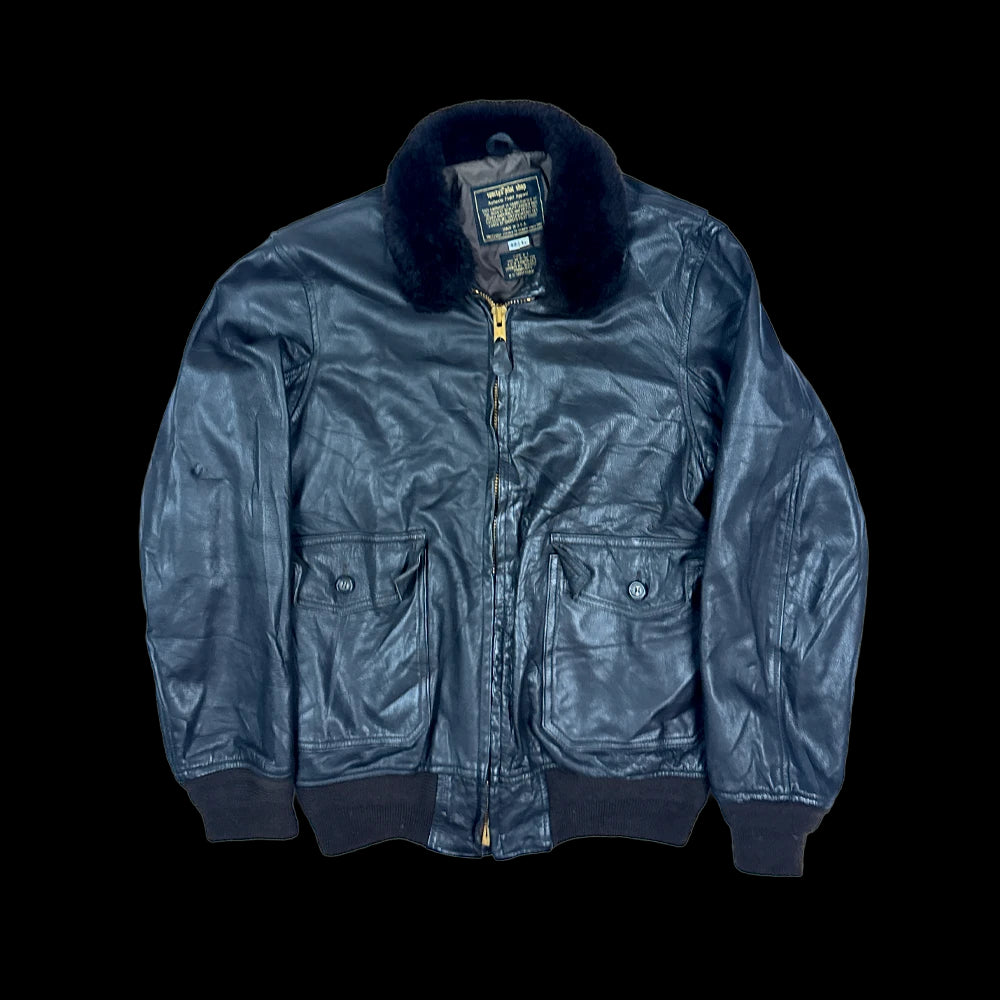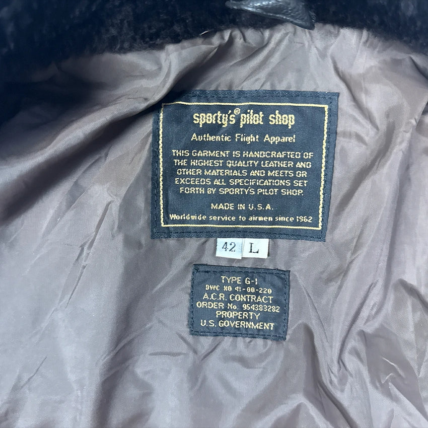 Leather flight jacket with a faux fur collar, elasticated wool cuffs and waistband, and two front hip pockets with flaps. This example is sized 42L and was manufactured in the USA by Sporty’s Pilot Shop.