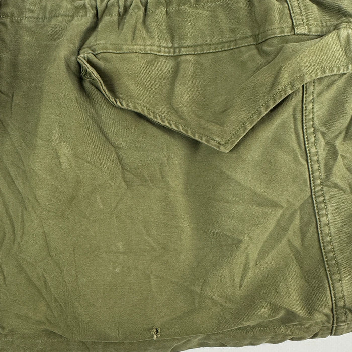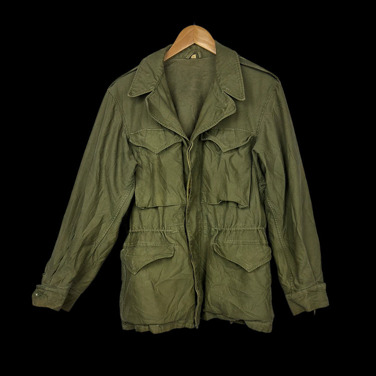The USGI M-1943 Field Jacket is a surplus four-pocket field jacket featuring lined hip pockets and a straightforward construction without a liner attachment system. This example is sized 38R, weighs approximately 1.2 kg, and has an unknown date of manufacture.