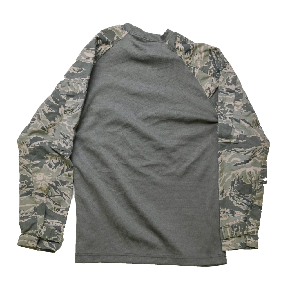 US Air Force ABU UBAC shirt in digital tiger stripe camouflage pattern. Features a quarter-zip front with stand collar and reinforced shoulder panels.