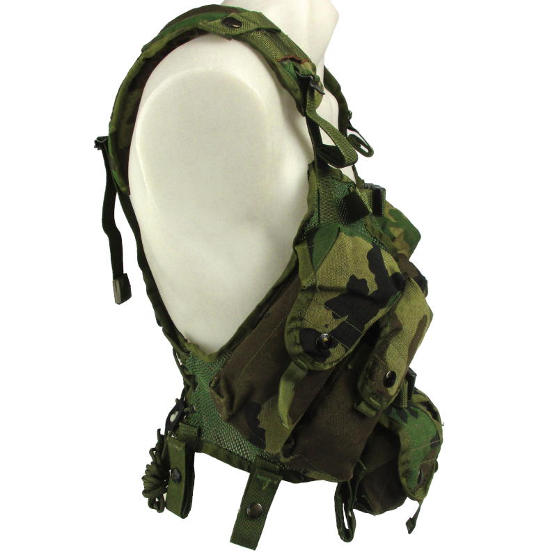 A genuine issue US military improved tactical load bearing vest. Used to load up on rifle ammunition and additional grenades while remaining concealed in woodland camouflage. Improved over its predecessor with the use of a mesh construction, angled pouches and stronger material. Ideal for the trigger-happy airsoft and paintball players who require extra ammo on the field.
