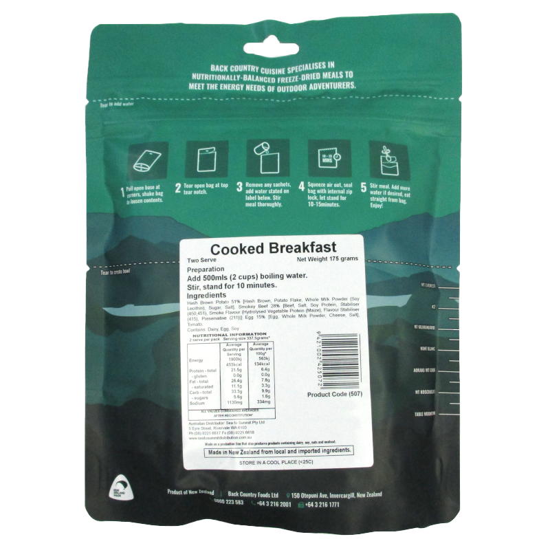 Our Back Country Cuisine cooked breakfast pack contains a hearty combo of smokey beef, egg, tomato and a hash brown potato mix. To use simply tear the bag at the top, remove any sachets, add boiled water and stir. Let stand for 10-15 minutes, stir once more for good measure and your good to eat after a hard slog!