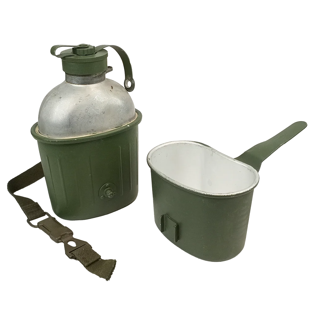 We have these in two different eras - older rauhlack/rough varnish though most are the newer glattlack/smooth varnish and some are a mix of both kinds to make a complete set. Each kind has differing clasp systems but each set had a cup with folding handle, canteen (lids are present but may be detatched) and the canteen sits in a cup with no handle. All used sustenance components are display/prop/collectable only and not for consumption use.
