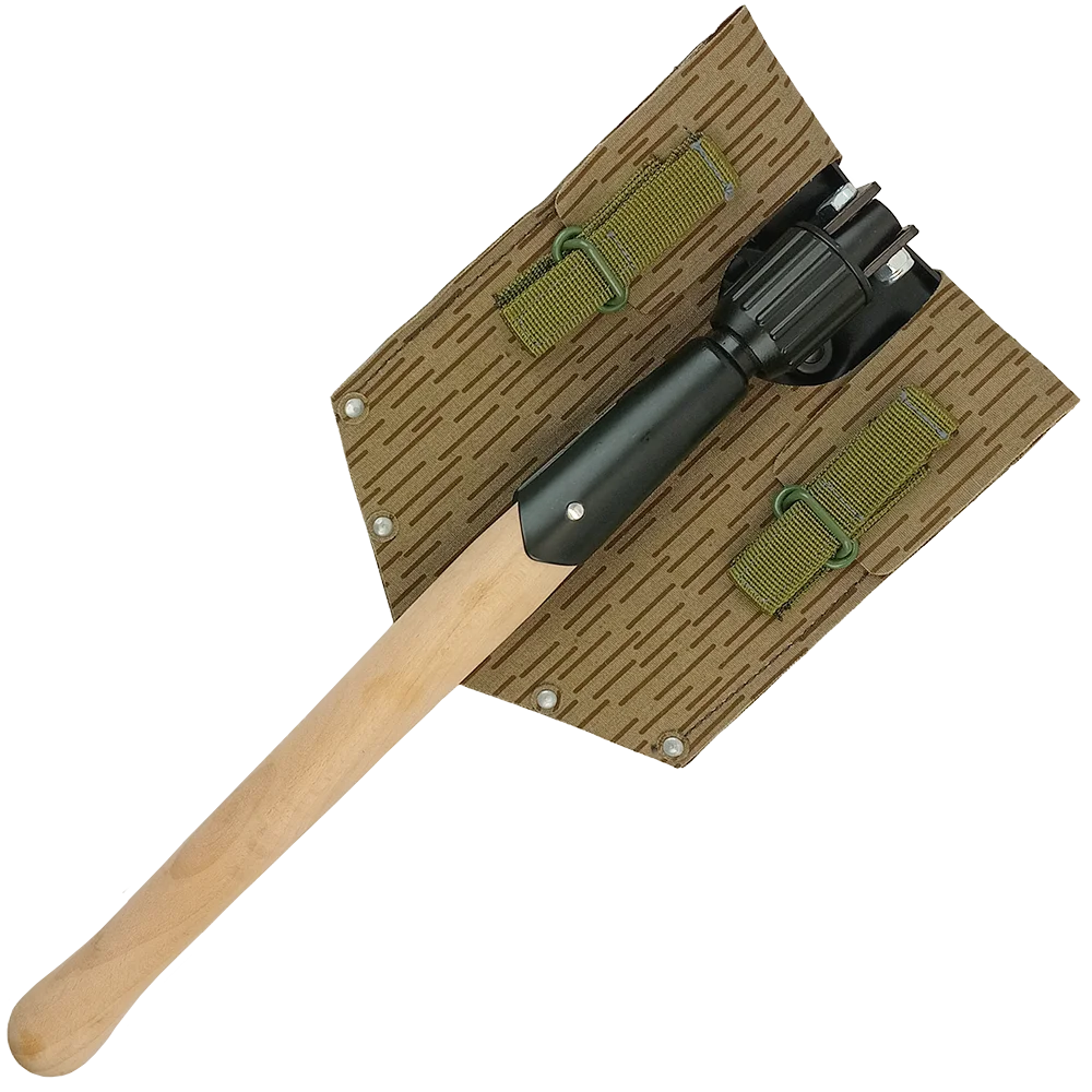 Content: Wood & metal shovel, fabric cover with leather inner patches, nylon strapping and metal rivets/fasteners