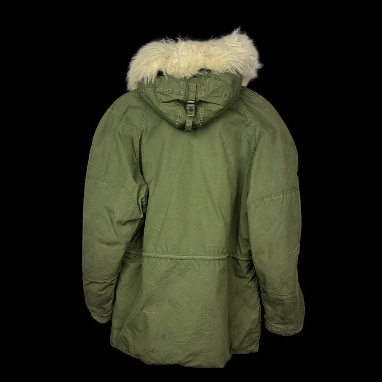 Surplus extreme cold weather parka featuring a synthetic-lined hood with ruff and lined hip and waist pockets, sized Large. This example shows visible wear consistent with a Fair condition grade, including stains on the left sleeve, missing buttons, holes around the inner shoulder lining, and wear to the cuffs.