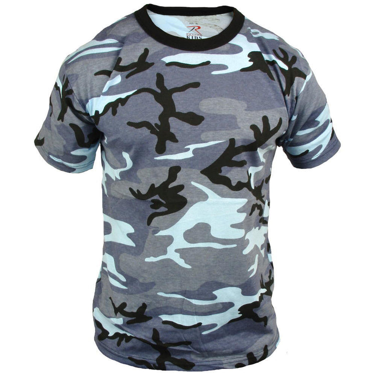 These sky blue colour camo t-shirts are perfect for summer. From Military Use, Airsoft Teams And Everyday Fashion; These Shirts Are Worn By Everyone. These comfortable camo t-shirts feature a poly/cotton blend for comfort and durability and tagless label to avoid that 'scratchy label' feeling from the regular sewn on variety.