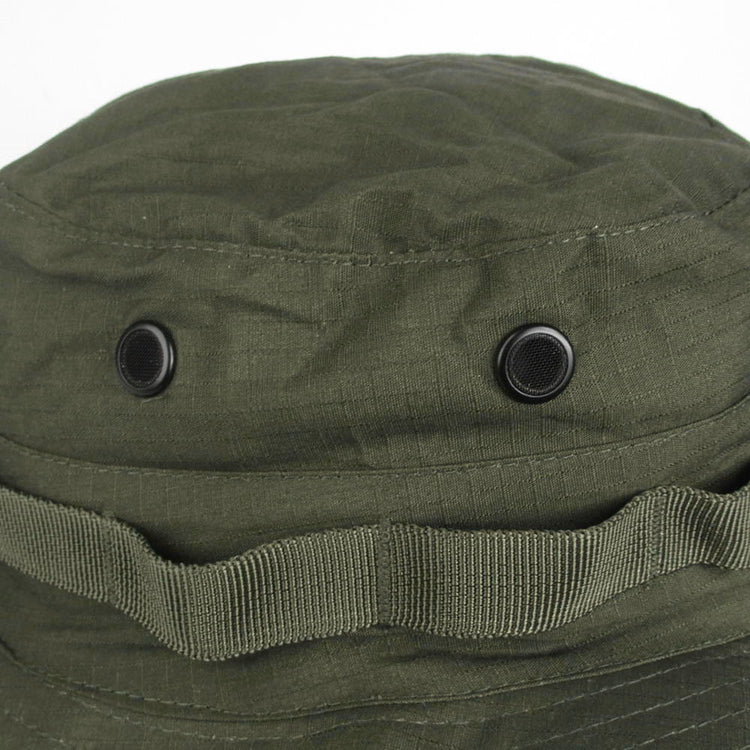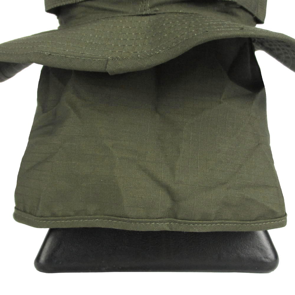 Boonie hats are already an excellent form of protection against the sun and some light rain. Now with the addition of a removable neck flap (via hook and loop strips), that harsh summer sun has almost no chance of scorching your neck. Keeping in typical boonie hat style, this hat has a foliage ring for adding vegetation to provide camouflage and an adjustable chin strap. An essential hat for fishing down at the river or long days hiking in the sun.
