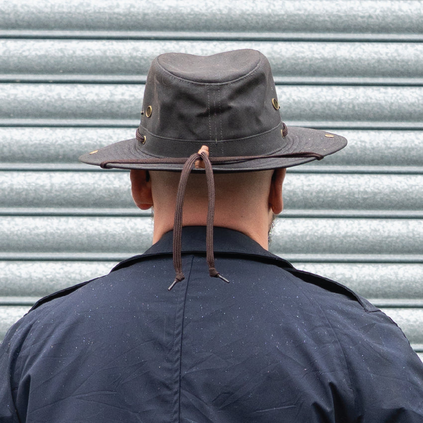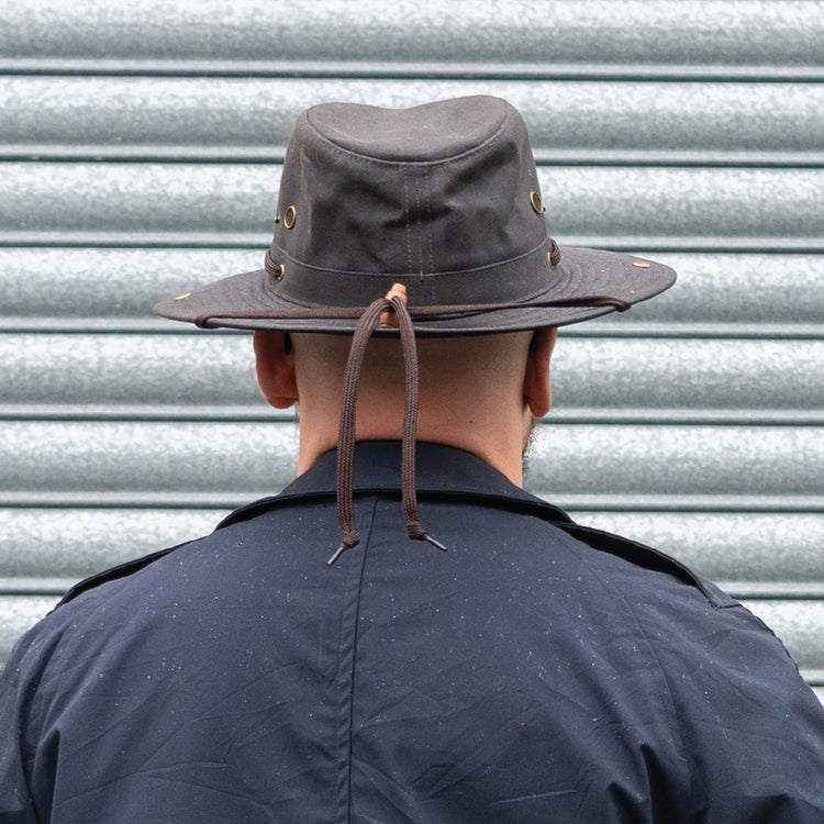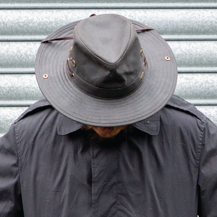 The poly/cotton construction is quick drying and water resistant. The nature of the oilskin takes on a distressed appearance with wear, nice and rugged. Features of the hat include a (removable) chin strap and snap-up sides. A small security pocket or "koala pouch" is on the underside of the hat. Protect yourself from the sun and pick up one of these hats for your summer adventures.