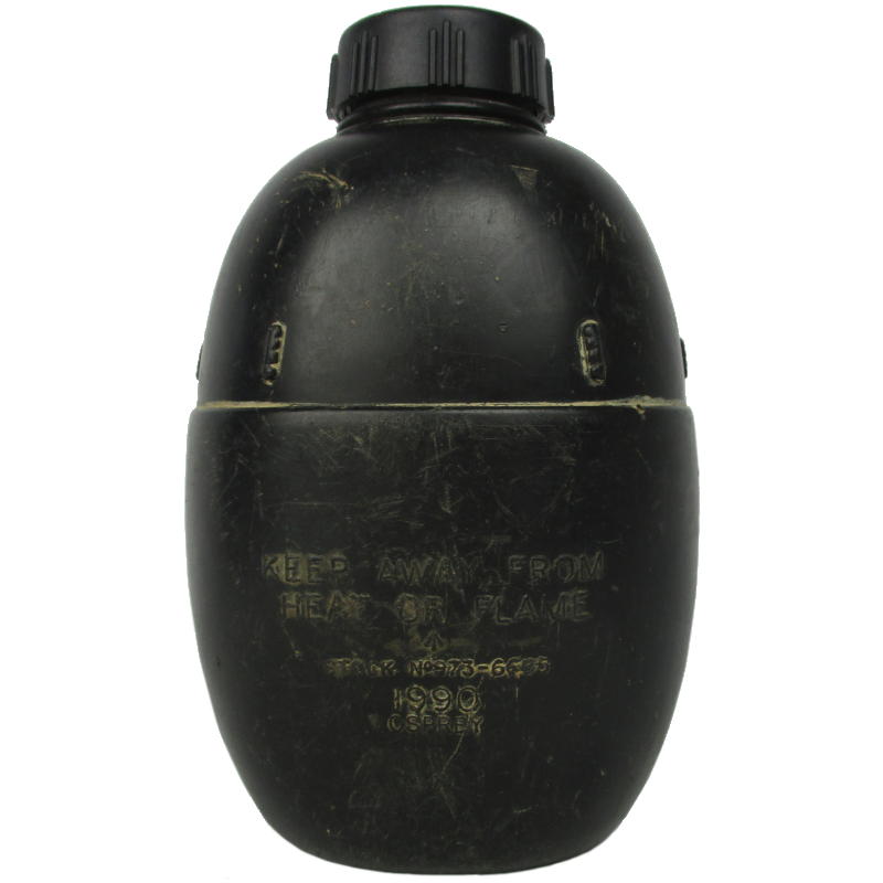 Osprey construct these canteens out of a durable plastic material. This is a tough bugger that would take a lot of force to split or crack. The lid is tethered on though it can be un-tethered if required (some may be missing this tether attachment). All used hydration components are display/prop/collectable only and not for consumption use.