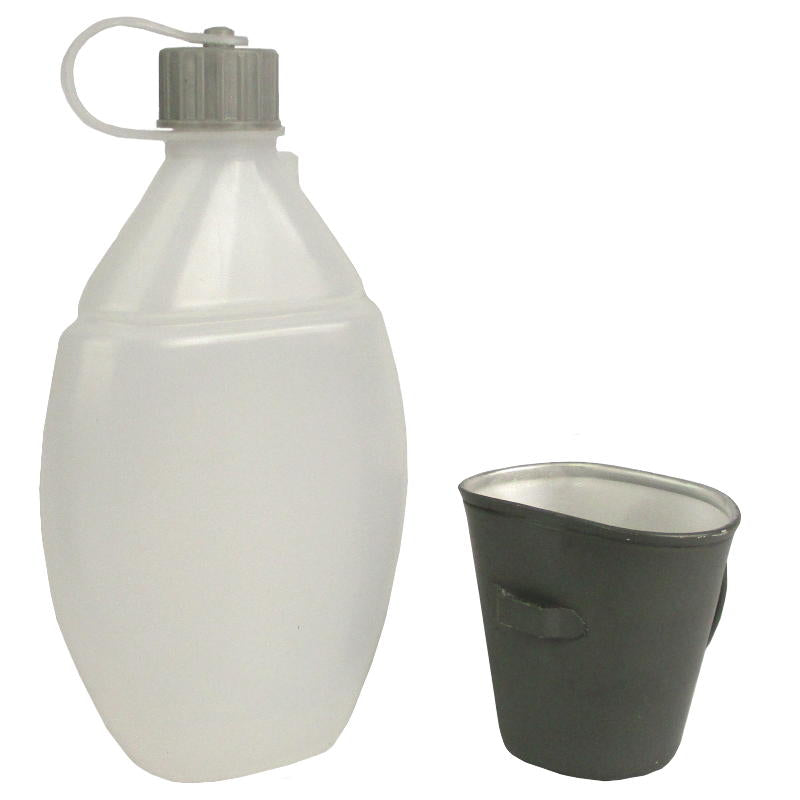 Get the complete canteen set of the former East German Army (or NVA - Nationale Volksarmee). Similar in design to the German WW2 canteen in which the cup is strapped on top of the canteen using the insulated cover. The canteen will hold approximately 1 quart (0.95 litres).