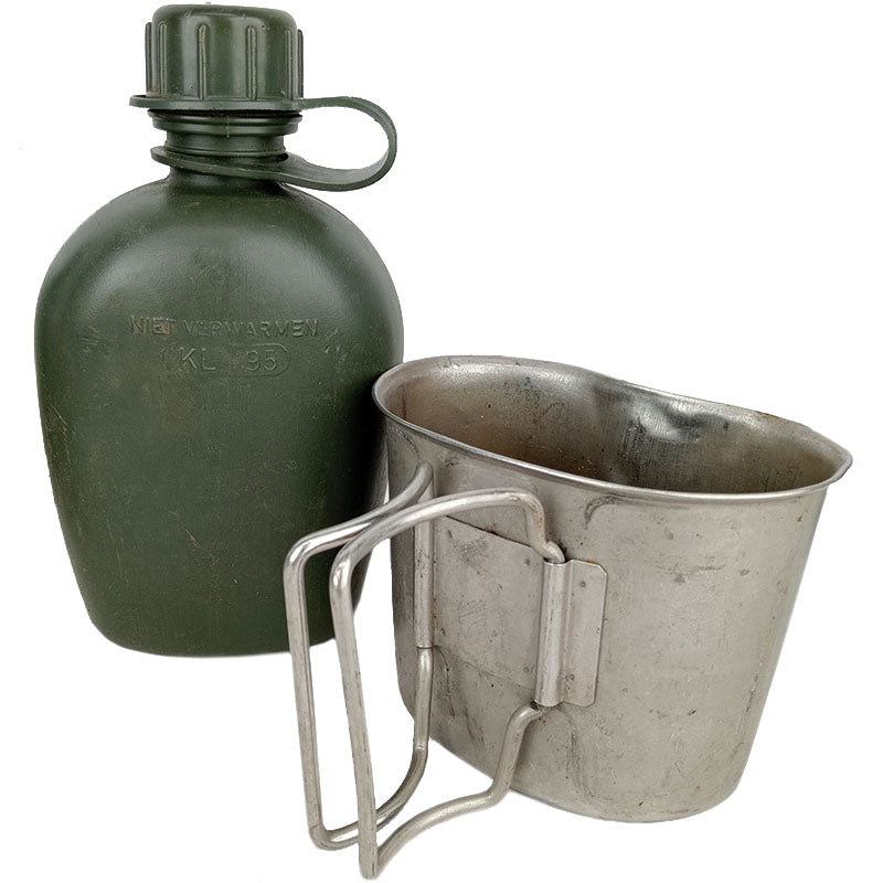 Pretty much just like the US versions, the Dutch Army have replicated a tried & true design albeit with a DPM camo cover. The canteen & cup are accessed with a snap dome cover which also has a light lining to help keep the water cool & absorb condensation. The steel cup has fold out butterfly handles so you can safely heat it and pick it up for a hot brew. Dual ALICE clips secure the cover firmly to any ALICE web gear belt.