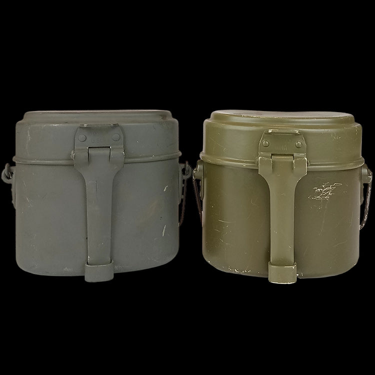 The Germans seem to have set a standard as their southern Austrian counterpart have copied their successful design. The mess kit breaks down into 3 parts and with a convenient carrying handle. Another similar sized tin slots into the large main section providing 3 different vessels for cooking. Some of these have slightly different colours between the lid and body and some appear to have been over sprayed in dark grey (like field grey). Some have different handle attachment fixtures and may be an older model. All used sustenance components are display/prop/collectable only and not for consumption use.