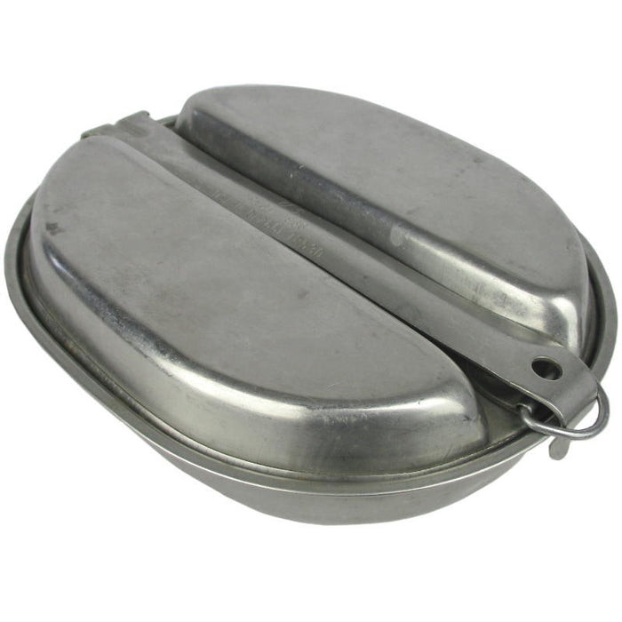 Made from stainless steel these are stove compatible and tough to boot. To use just flick the D-ring down and pull pressure outwards on the handle so it can swing open. The kit separates into a pan with a long handle to cook with and a dual channel tray to serve food in. A bonus to these more rear echelon mess kits is there are no hard to reach corners making them easy to clean. All used sustenance components are display/prop/collectable only and not for consumption use.