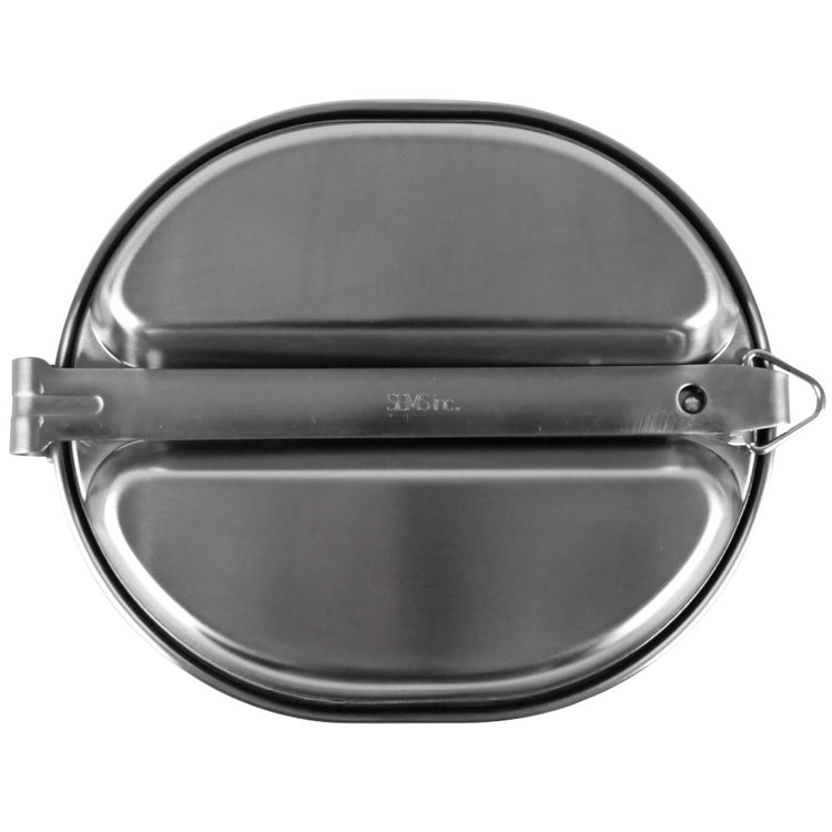The mess kit consists of two cylindrical containers that nest together. The larger bottom container serves as the main compartment, while the smaller top container acts as a lid and secondary compartment. While not being used, the unit is held with a folding handle that snaps into place.