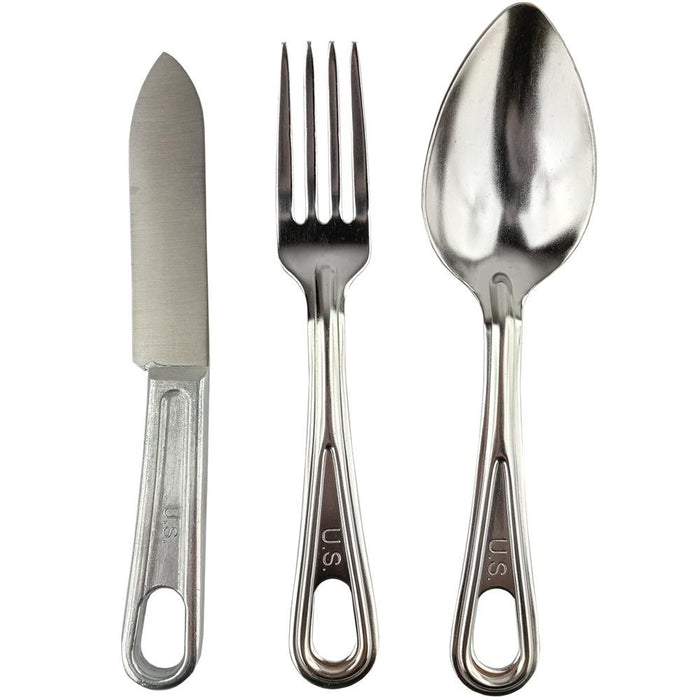 From socks, tooth brushes, underwear and forks - the US military had to equip its fighting men from head to toe. Unsurprisingly, a Army needs utensils to be fed! Issued together with a knife, spoon and fork. The originals were issued with leather covers (unfortunately no covers included) but alternatively you can loop these together with some string through the holes on the handles. Made with modern stainless steel.