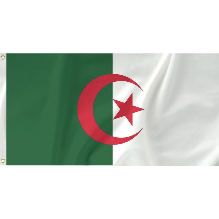 Algeria's flag is split with a simple green and white background with a 5 pointed red star and crescent as a symbol of the nations dominant faith. The flag was adopted in 1962.