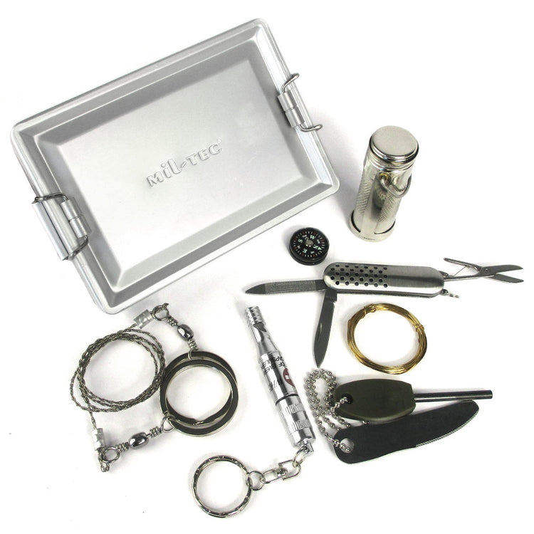 When you find yourself in a tough situation, or the beginning of the apocalypse, a packed survival kit is an essential item. The aluminium box is lightweight yet durable, with the contents securely locked in by the watertight lid. Be sure to keep this kit close by, at home, in your glove box, or take it camping!