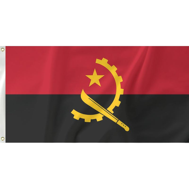The Angolan flag's background is divided in half. The red colour representing the bloodshed during Angola's struggle for independence. The black half represents Africa. The machete, gear and star is a deliberately similar to the USSR's hammer and sickle. The machete representing the peasantry and the gear representing the industrial class.