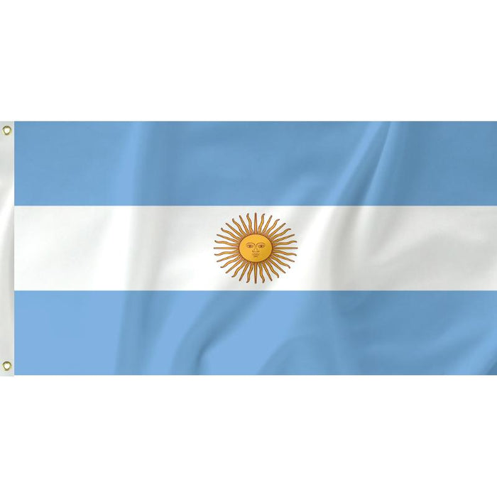 Adopted in 1812, the national flag of Argentina has two light blue stripes with a white stripes and the yellow "Sun of May" in the center.
