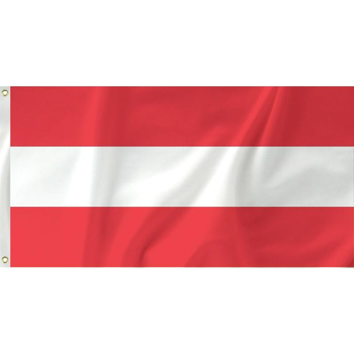 The flag of Austria has three equal bands of red (at the top and bottom) and white in the middle. The triband is based on the medieval Babenberg dynasty's coat of arms. The flag has a white strip on the side with two metal eyelets.