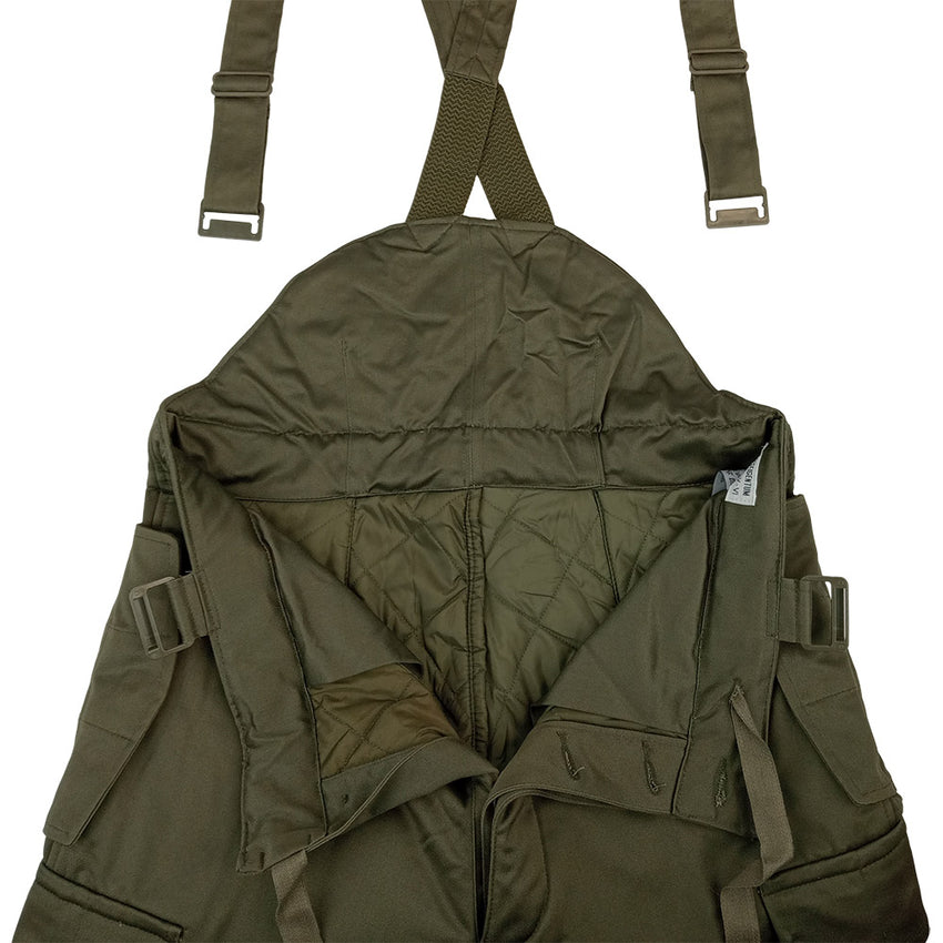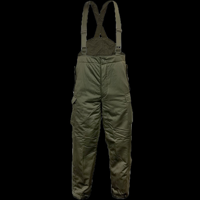 In the classic colourway RAL7013, these Austrian winter pants are generously sized to be worn over layers and the back has a high rise so no cold drafts get in there. Held up with adjustable braces, these are lined with polyamide, have a semi-shiny polycotton outer and are basically unissued- the only thing holding them back is perhaps some storage crud or dust. Designed to be short in the leg to fit into winter boots, perhaps select a size taller if you are not a winter boot person but keep in mind these are already oversized in the waist to accommodate underlayers.