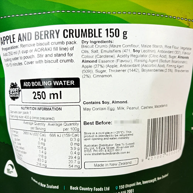 Our Back Country Apple & Berry Crumble pack contains a satisfying mix of freeze dried apples and berries topped with a delicious gluten free cookie crumb. To use simply tear the bag at the top, remove any sachets, add boiled water and stir. Let stand for 10-15 minutes, stir once more for good measure and your good to eat after a hard slog!