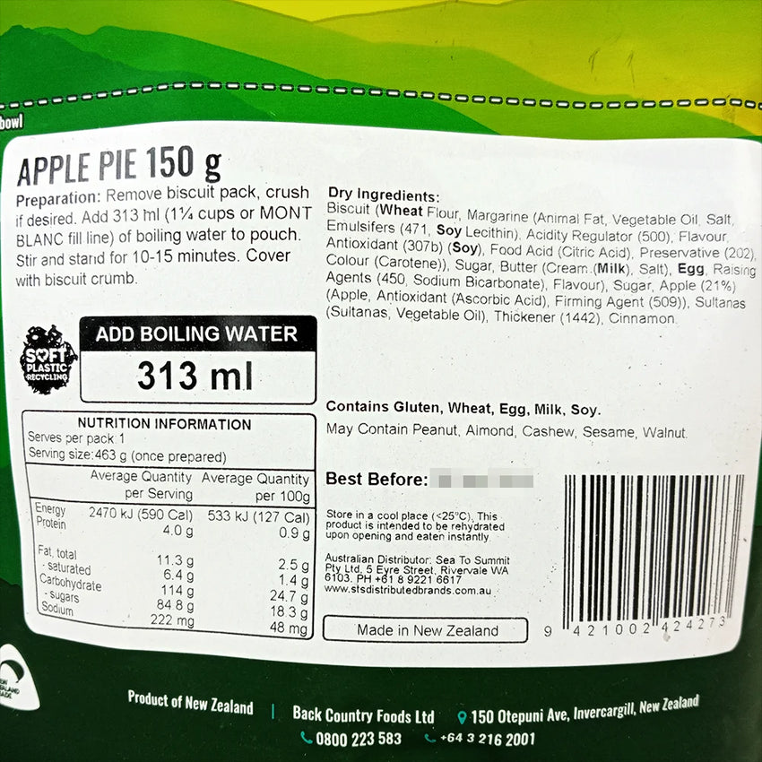Our Back Country Apple Pie pack contains a delicious mix of freeze dried apple with sultanas and cinnamon, topped with shortbread biscuits. To use simply tear the bag at the top, remove any sachets, add boiled water and stir. Let stand for 10-15 minutes, stir once more for good measure and your good to eat after a hard slog!