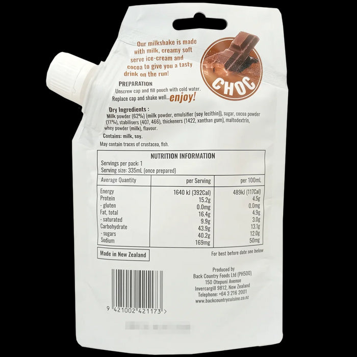 Who needs a blender and fridge when you can have a Back Country chocolate smoothie! Small, easily stowed and with 3+ years of shelf life these are great for long hiking journeys or to add some flavour to your emergency food stocks. To use simply unscrew the cap and fill the pouch with cold water. Replace and shake well - then enjoy!