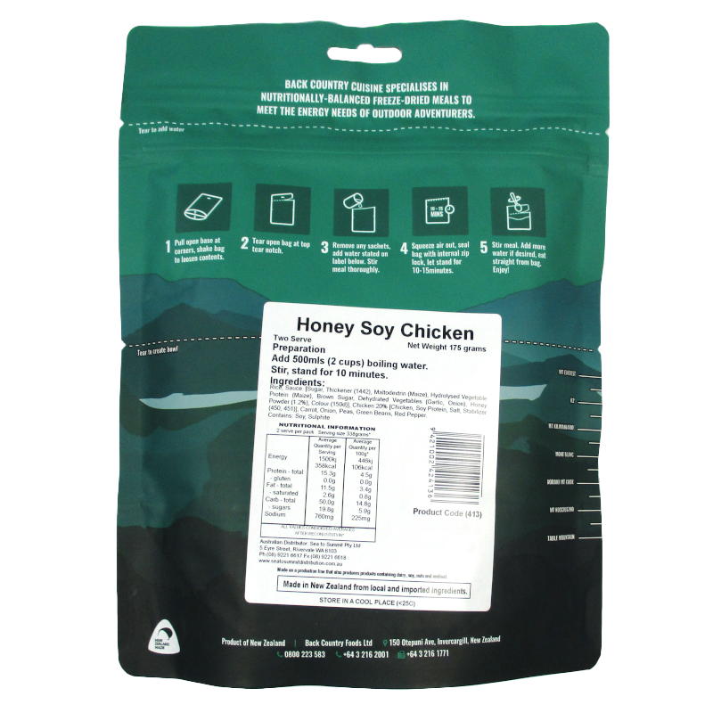 Our Back Country Cuisine Honey Soy Chicken pack contains chicken and vegetables with a spicy blend of rice. To use simply tear the bag at the top, remove any sachets, add boiled water and stir. Let stand for 10-15 minutes, stir once more for good measure and your good to eat after a hard slog!
