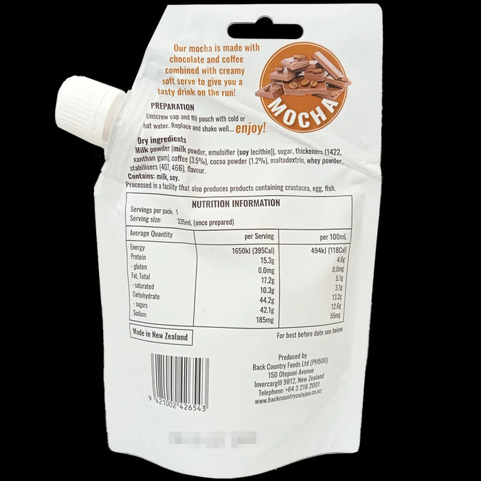 Who needs a blender and fridge when you can have a Back Country iced mocha smoothie! Small, easily stowed and with 3+ years of shelf life these are great for long hiking journeys or to add some flavour to your emergency food stocks. To use simply unscrew the cap and fill the pouch with cold water. Replace and shake well - then enjoy!