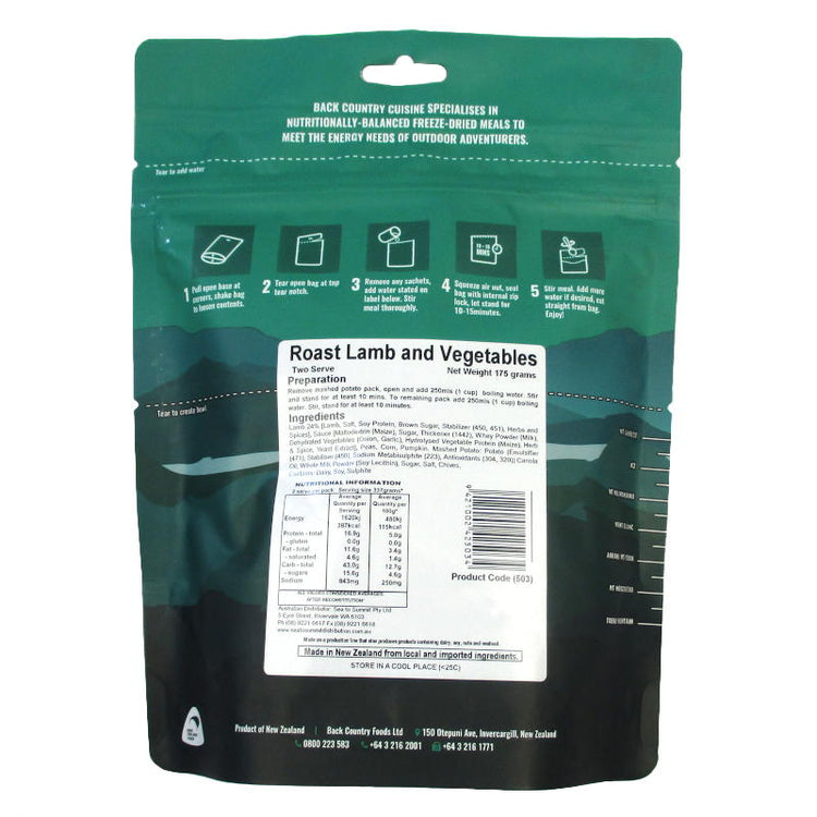 Our Back Country Cuisine Roast Lamb & Vegetables pack contains oven baked lamb and mint gravy with vegetables and creamy mashed potato. To use simply tear the bag at the top, remove any sachets, add boiled water and stir. Let stand for 10-15 minutes, stir once more for good measure and your good to eat after a hard slog!