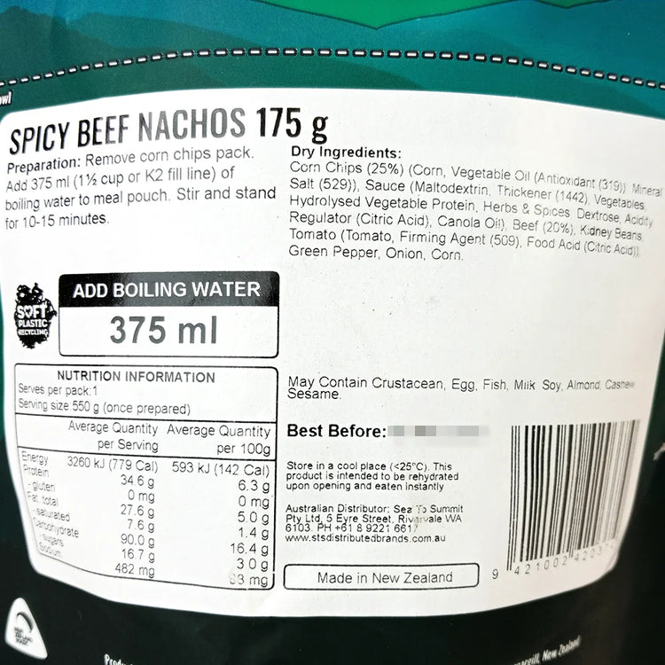 Our Back Country Spicy Beef Nachos pack contains a satisfying mix of freeze dried beef mince, kidney beans, corn and tomato in a hot chilli sauce with corn chips to dip. To use simply tear the bag at the top, remove any sachets, add boiled water and stir. Let stand for 10-15 minutes, stir once more for good measure and your good to eat after a hard slog!