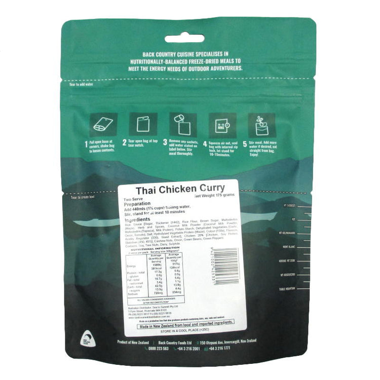 Our Back Country Cuisine Thai Chicken Curry pack contains coconut milk & curry with green beans, cashew nuts and chicken. To use simply tear the bag at the top, remove any sachets, add boiled water and stir. Let stand for 10-15 minutes, stir once more for good measure and your good to eat after a hard slog!