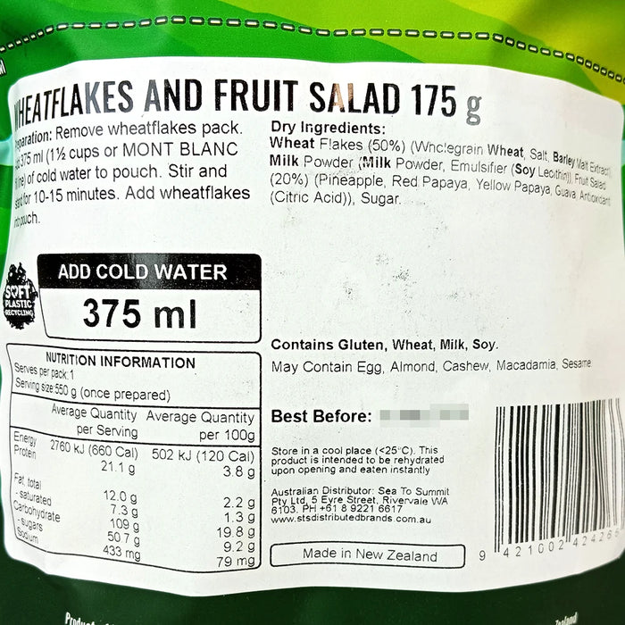 Our Back Country Wheat flakes & Fruit Salad pack contains a satisfying mix of freeze dried delicious wheat flakes and fruit salad with milk. To use simply tear the bag at the top, remove any sachets, add cold water and stir. Let stand for 10-15 minutes, stir once more for good measure and your good to eat after a hard slog!