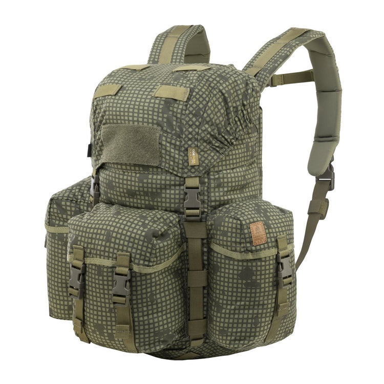 The pack is designed to contain the most important equipment for a short journey. The main chamber with a capacity of 18L houses clothing and equipment for camping, in pockets on the sides we can fit food or water bottles. The middle outer pocket has a draw string collar that protects small items from being lost. The Bergen has three places to carry an axe and two pockets for a saw or knife. You can attach pockets or gloves to the MOLLE/PALS hidden on the front (under a flap and to the lid). Additional items of equipment can be attached from below or to the backpacks flap. Made entirely of Cordura 500D.