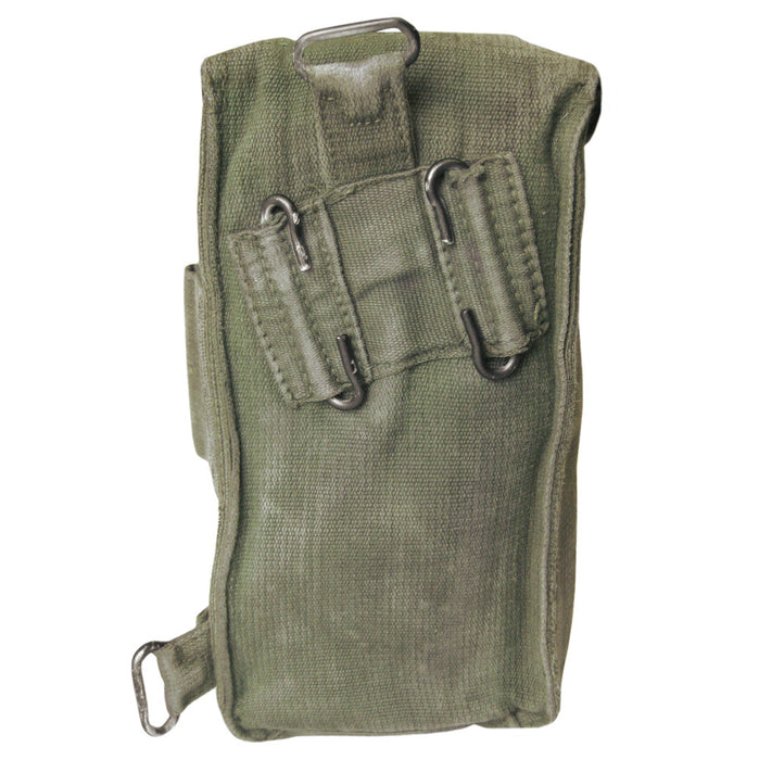 Here we have a genuine issue British army magazine pouch, part of the 58 pattern webbing system. This pouch is the perfect size for a variety of magazines and general storage. Unlike the RH pouch, this one has a pocket for carrying the users bayonet.