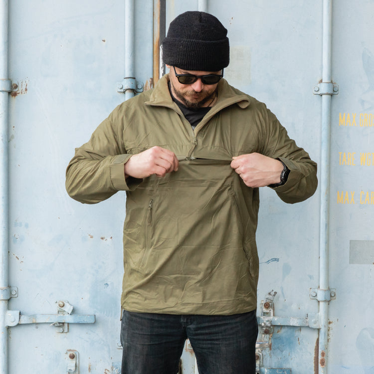 This fellow is a fleece lined, anorak style mid layer. These are close fitting but could be worn with a thin base layer (such as a thermal top) underneath. These are so close fitting - especially around the chest/armpits - we recommend to size up for comfort (or aesthetic). These ''smocks'' have wind sealed zips all over (quite a few!) and aid in temperature regulation and function. The two slanted pockets are access points for one kangaroo style pocket (great for warming hands) and the mid-chest pocket adds more storage. Zips to the underarms and torso sides let in some fresh air if you are a bit too toasty. The whole interior is lined with fleece and the exterior is a thin ripstop nylon. A small emergency hood is stowable in the neck. Hook & loop adjustable waist and cuffs + a draw cord to the neck seal you up for extra toastiness.