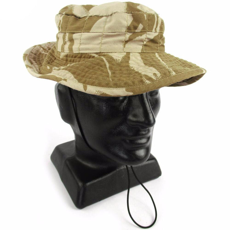 These fantastic genuine issue boonie hats have been sewn down, soldier style, to stop them from sticking out too much. If you feel the need to unstitch the thread and restore this boonie back to it's original state, you can. Finished in desert DPM camouflage for effectiveness in arid terrains. An adjustable cord chinstrap and quality material make this a perfect piece of headwear for hotter days.