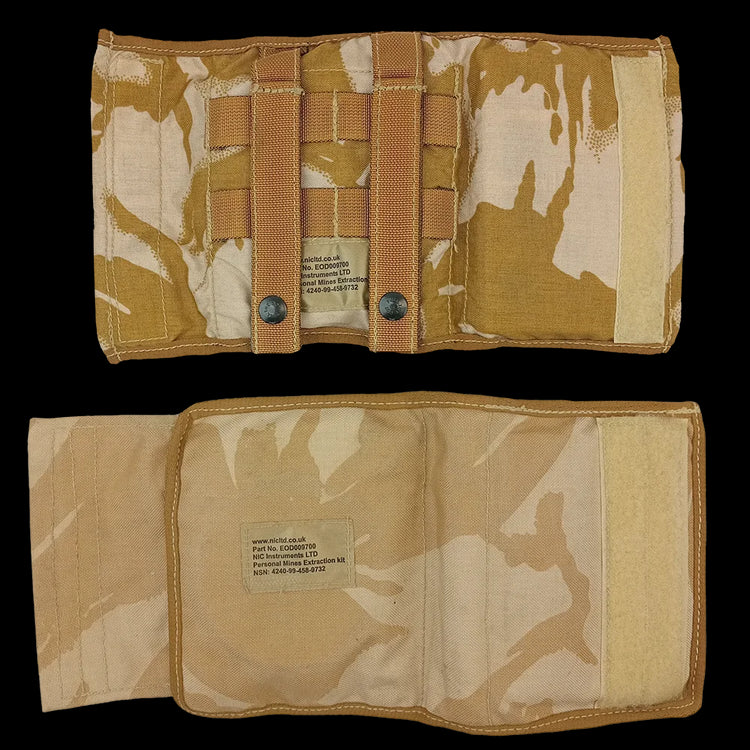 These pouches are what the British Army issued to its troops to help aid mine extraction and clear paths through spicy fields. Originally these would be packed with white & red plastic markers - red for suspect, white for safe. They would also issue glow sticks for marking areas at night. The long narrow pocket on the inside is designed to carry a fold out mine prodder (basically a fancy pointing stick) and elsewhere, handy instruction cards for quick reference mine clearing. Some pouches contain a few of these items still but when empty, are a pretty wicked admin pouch or interesting bit of kit. Maybe you just love desert DPM, nothing wrong with that!
