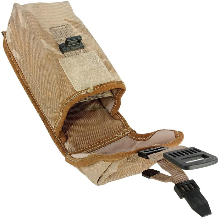 These pouches were made as part of the British Army's Osprey set, for operations in the Middle East. Each pouch can carry 2 x SA80 magazines. These have a 'Spanish' fly buckle with optional hook & loop underneath if you want faster reloads. The top lid closes around not just the front but also the sides to help prevent dust or any other debris from getting in and jamming your mags up (pretty crucial in the desert!). With MOLLE attachment these go on Osprey vests and anything else MOLLE surfaced as well. Add several to your British GWOT kit, whether it be for a collection, airsoft or real steel.