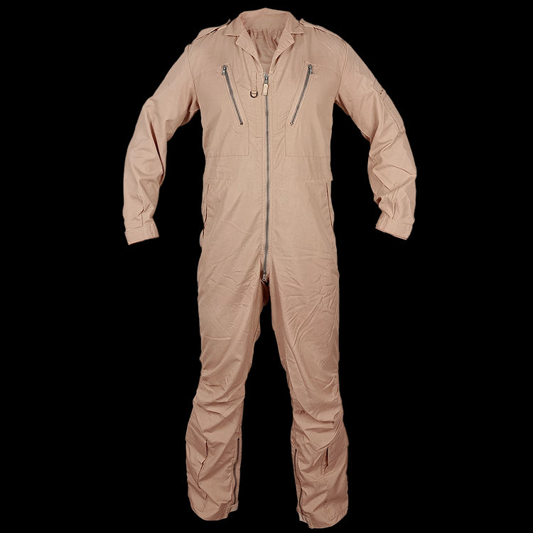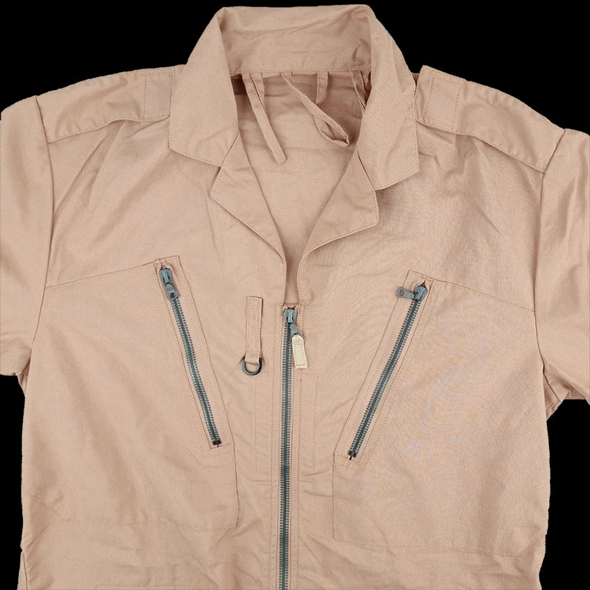 These are the tan edition of the British Mk16 overalls but it's kind of a cooked salmony-tan. Some say that's good for desert camouflage, some just think it's neat. Like a lot of surplus, the UK government had multiple different contractors working on these - more oddly, some of these German. More over, the German models work on German sizes - we have individually sized these so everything will fall into the size ranges we have made. Despite some German bits on some labels on a few, they all have some English and have matching NSN numbers traced back to British Air Force use.