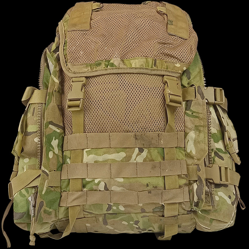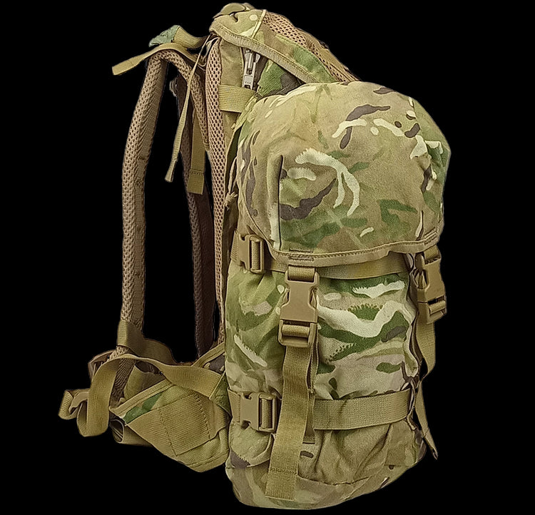 The British Army ECM (Electronic CounterMeasures) Lightweight Bergen made by Karrimor SF is a ~45‑litre nylon Cordura patrol pack made with some unique features for British soldiers lugging around electronic gear.