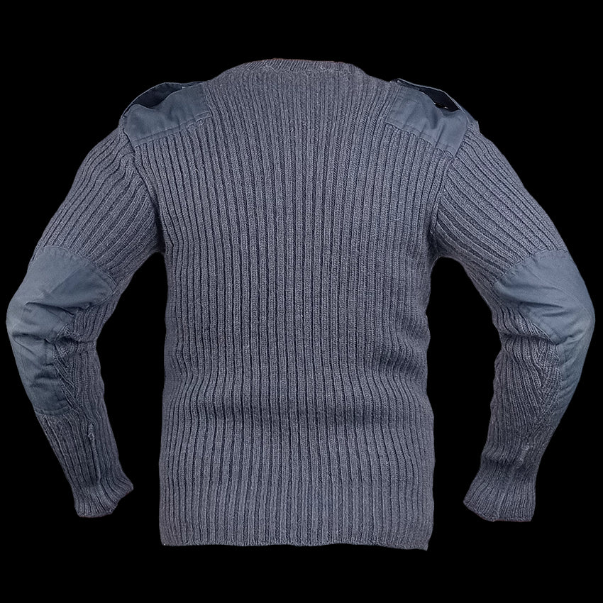 Just when you think there are enough British wooly pullys, another variation shows up. These are British Royal Airforce wool blend jerseys with the wide ribbing weave like the commando style - just with a V-neck. These are RAF blue too of course, which is kind of like a dirty sky blue - though somewhat inconsistent. Some may have insignia attached but some may have none. The reinforced areas & epaulettes are really the only hint that this cosy jersey wasn't originally for the general public but it still blends in to civilian life alright.