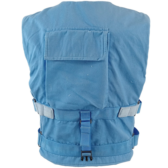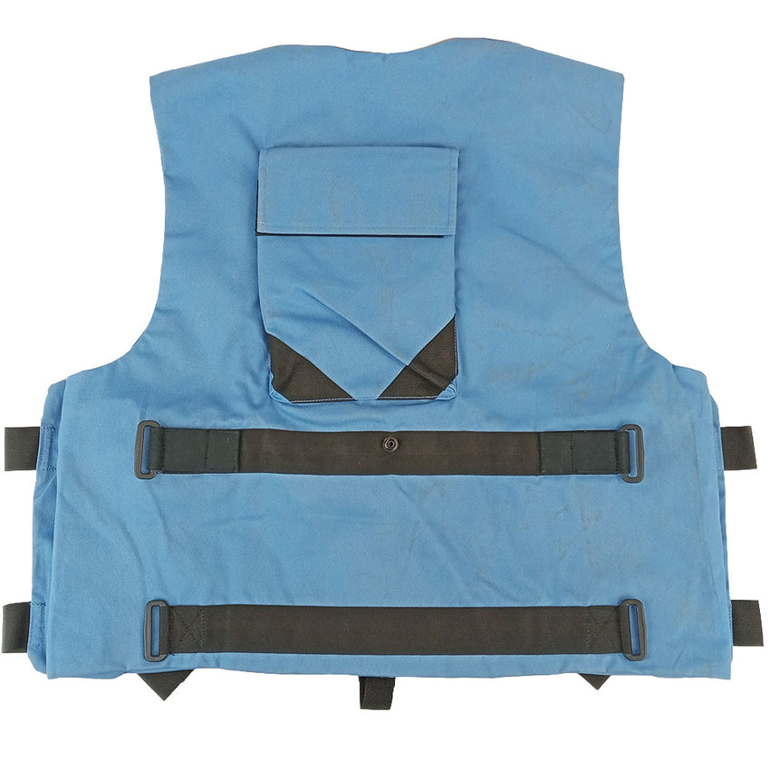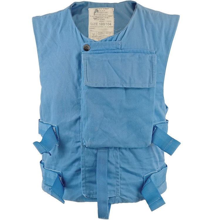 Designed to be obvious and non threatening, the British United Nations cover vest is on the case. Two styles are in this batch but just as blue as each other.