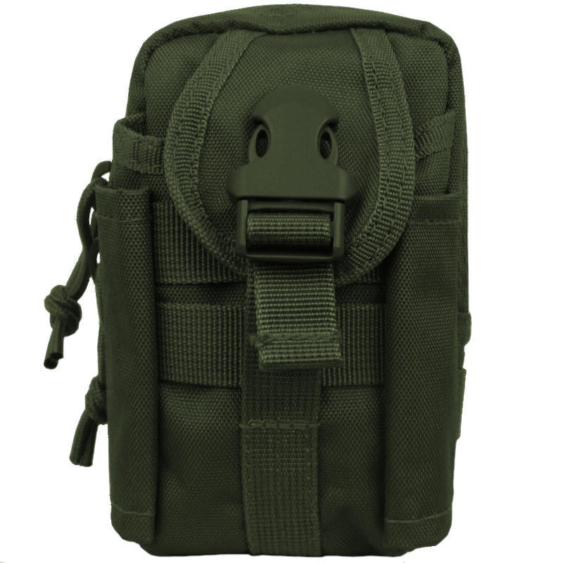 The main compartment is a perfect size for compact cameras and cellphones. It also has two internal sleeve pockets on either side which can fit small objects like a lens cloth, business cards or a few bits of first aid. This main pouch is easy to access as it has dual zippers both with large nylon chord pull tabs. The front has a slightly smaller pouch which is secured by a adjustable quick release buckle. It is flanked by two external open bottomed loops which can hold anything from large markers to glow sticks. At the top of the pouch there is a D-Ring tab if you wished to attach anything further such as key-rings. All of this comes with two PALS tabs on the back so you can attach it to any MOLLE webbing system. If you are looking for a small general purpose utility pouch, look no further!